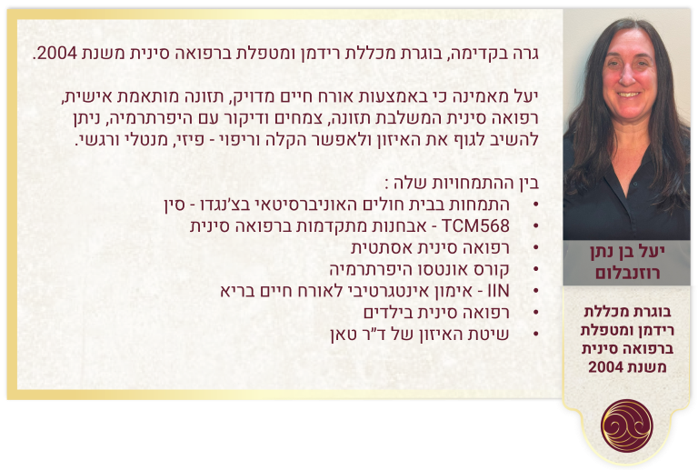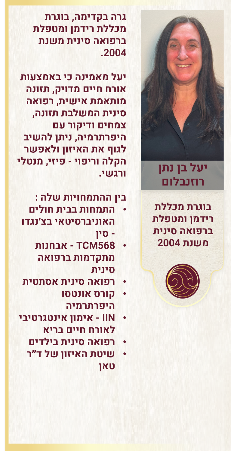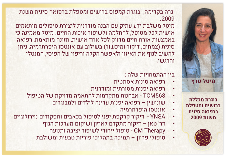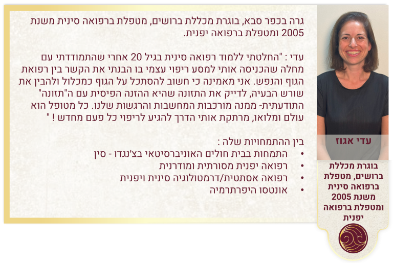 זהר ברק אור הינה בעלים של קליניקה גדולה לרפואה סינית בשרון.