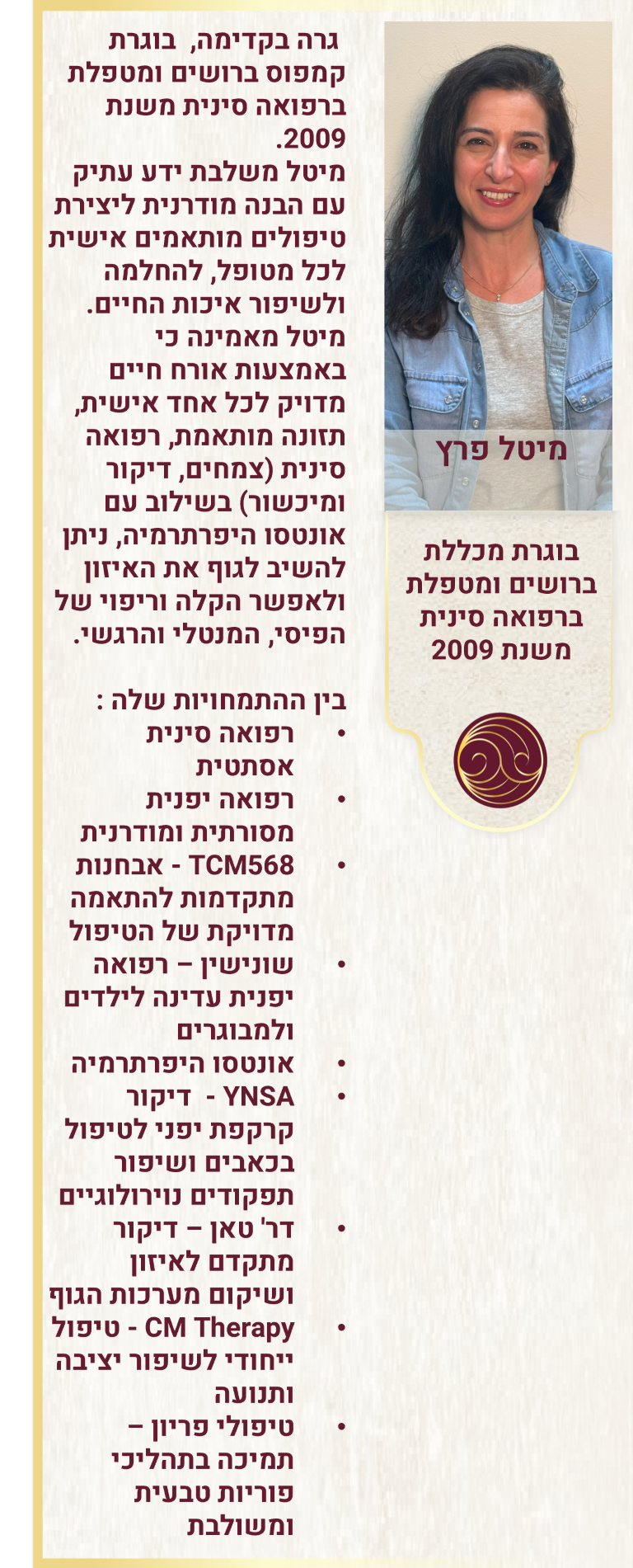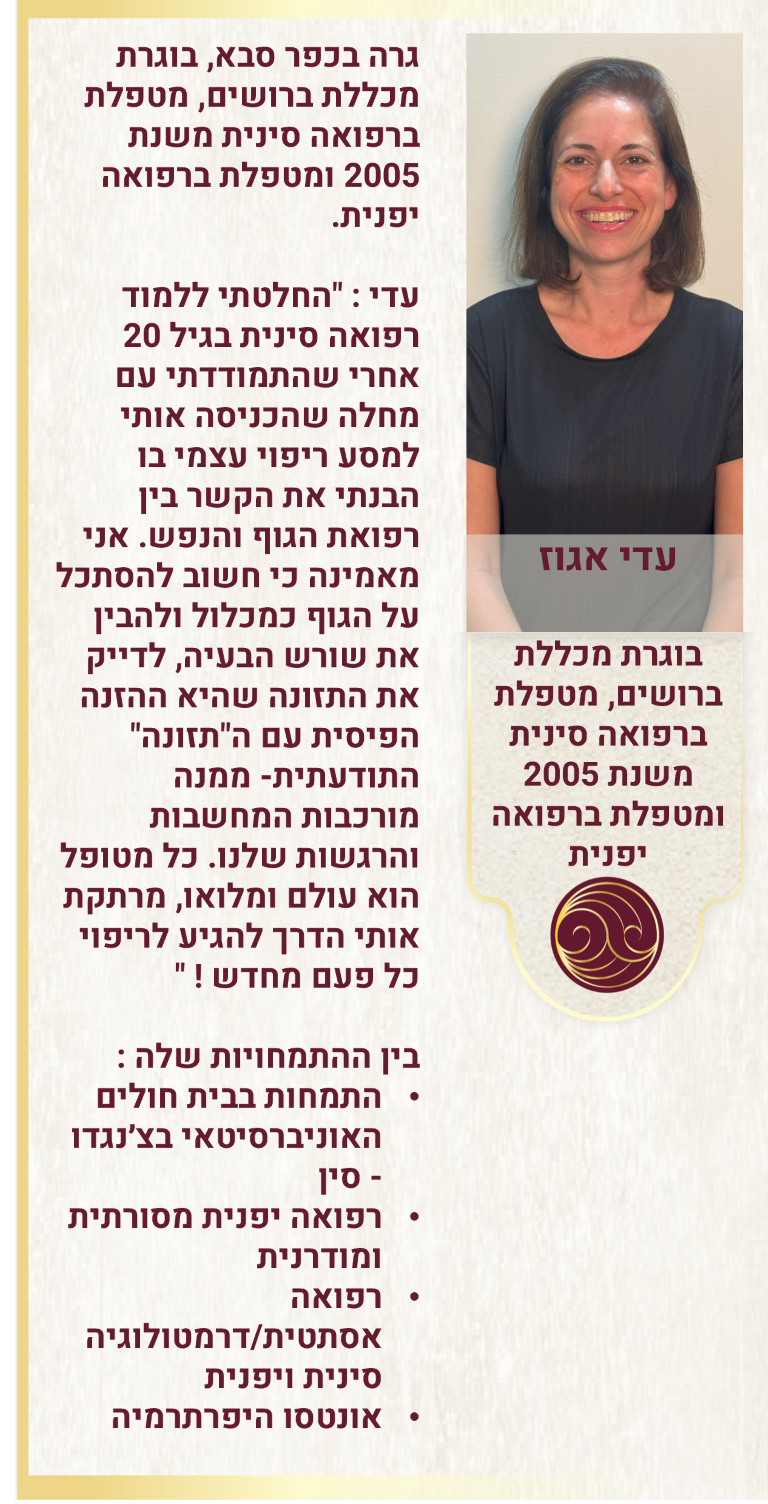 עימה מטפלות 5 מטפלות ותיקות, מנוסות ומיומנות המשלבות טיפולים ברפואה סינית ויפנית עם טיפולים ברפואה אסתטית וטיפולי אונטסו היפרתרמיה בכל מגוון קשת הפתולוגיות, המחלות, הכאבים ושיפור איכות החיים, טיפולי שיאצו, טווינה, רפלקסולוגיה ועוד.